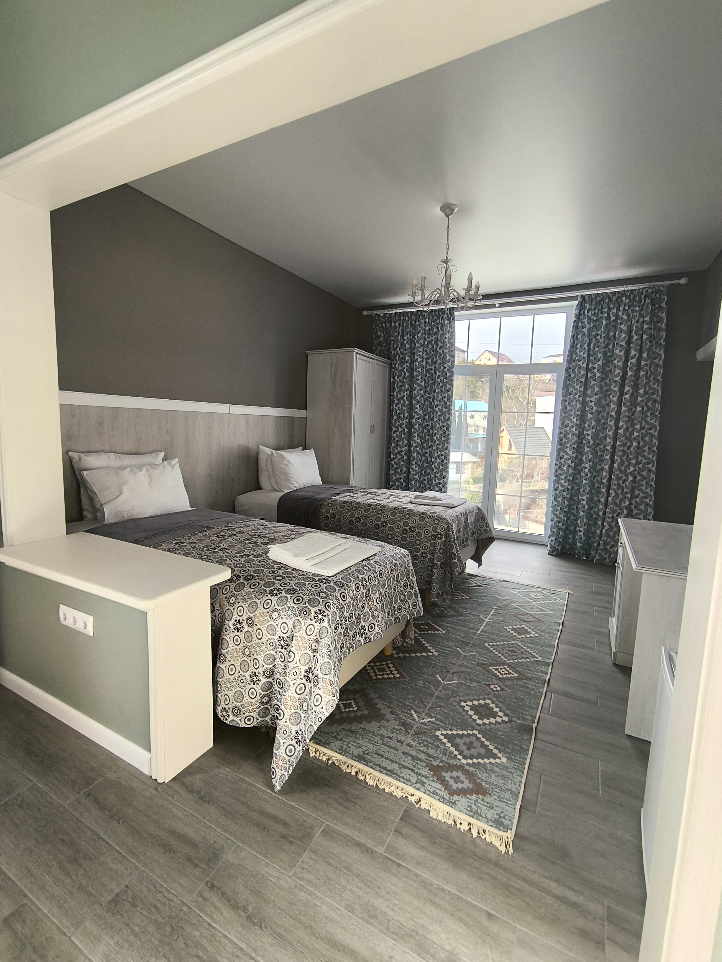 - Мебель: вешалка, зеркало, кровати односпальные /одна двуспальная кровать, прикроватные тумбочки, стол, стулья, шкаф